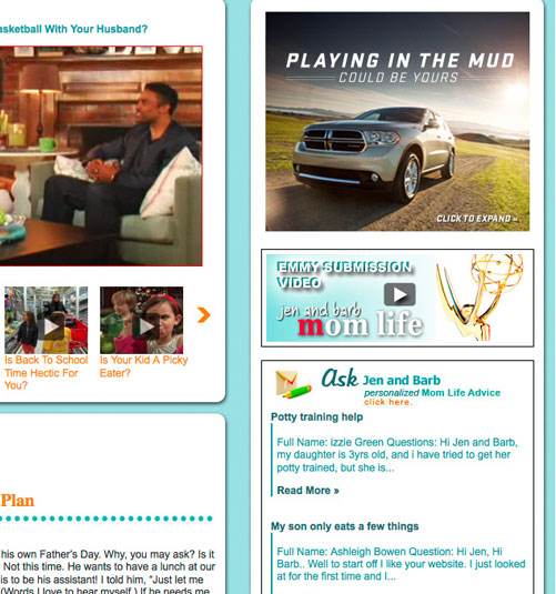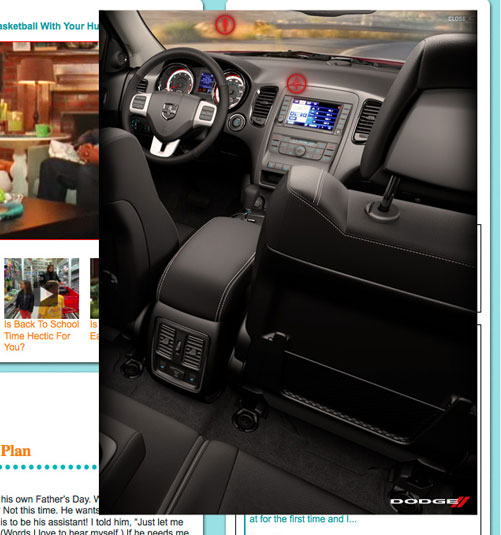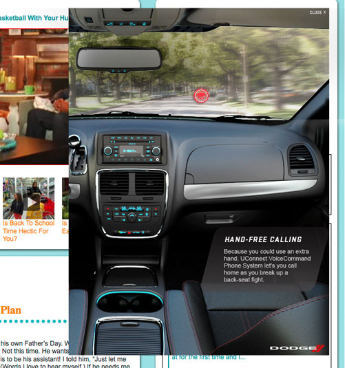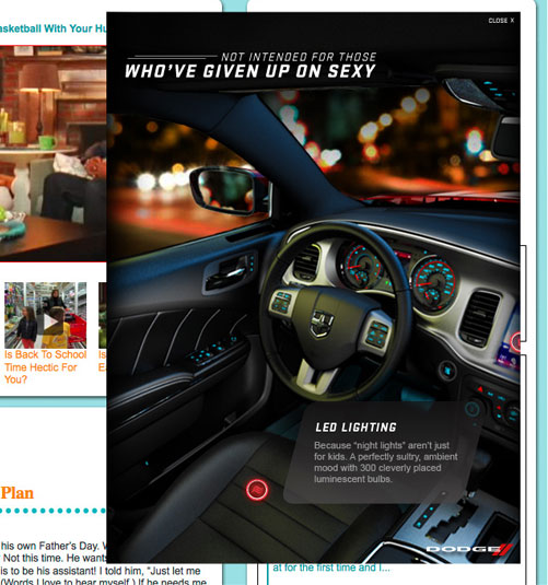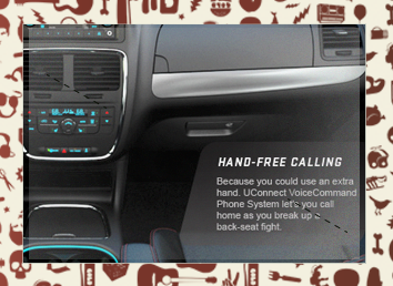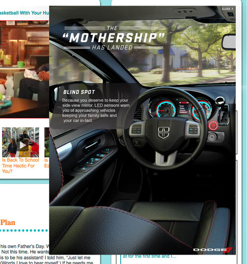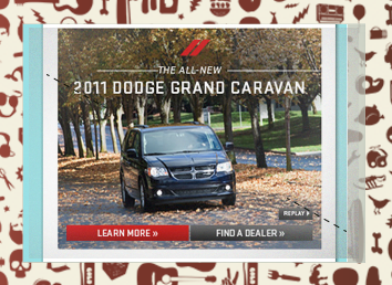 The well know Jen & Barb mommy blog paired up with Dodge to do interviews based on what driving a sports car would be like. What more of a better chance then to pair that up with an interactive show case for Charger, Durango, and Grand Caravan. These are the examples of my Interactive Direction with the Richmedia banners for all three vehicles.