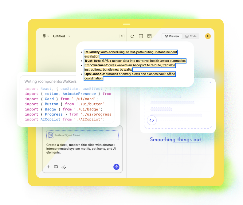 Here’s me first on Figma Make, opening up the platform, adding prompts like lets solve areas in “automation in pet scheduling” & a WHAT IF – “we can solve for real-time pet narratives,” and quickly moving from idea in my head to initial prototype.
